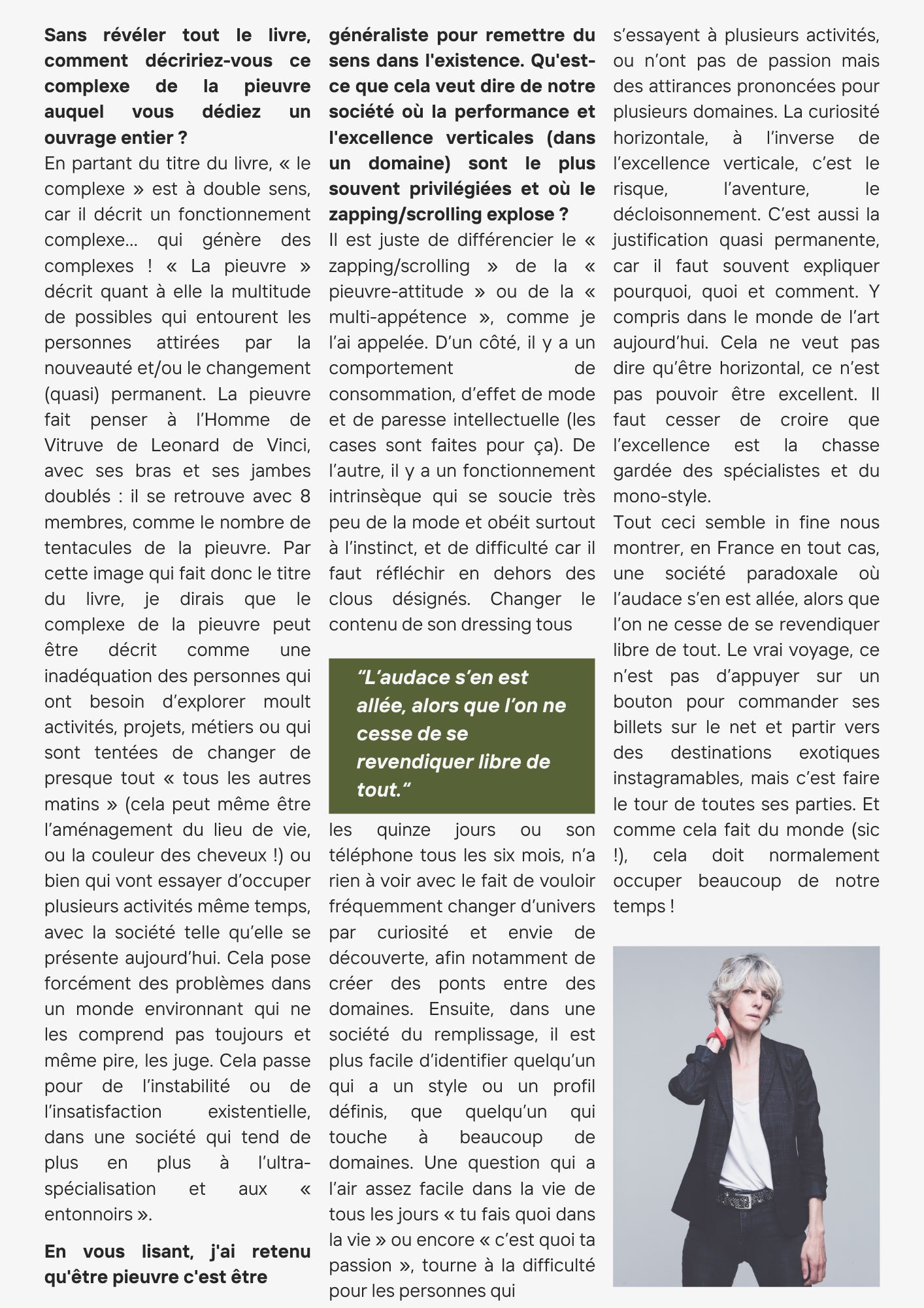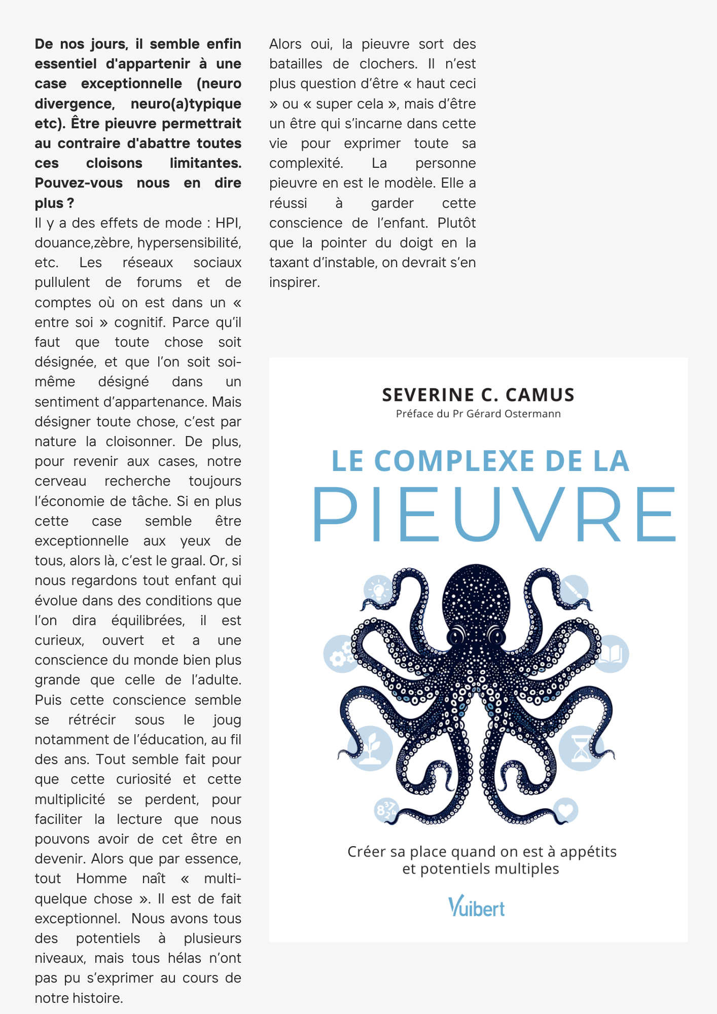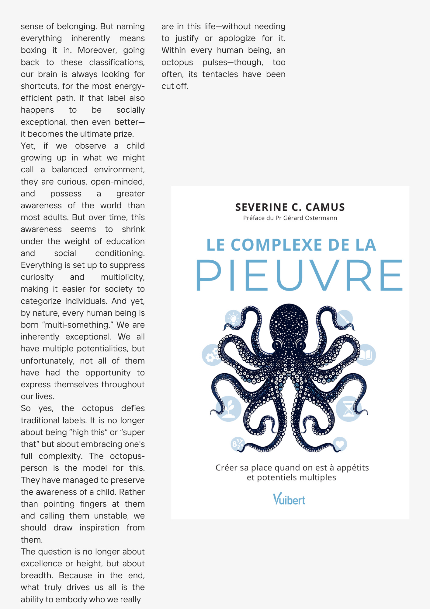 Peut-être vous demandez-vous où je veux en venir. Je dois l’avouer, je n’avais pas prévu de vous parler de tout ça en octobre puisque j’ai tout supprimé depuis mais l’idée globale était la suivante : les cases. Car, en cette première lettre faisant aussi office d’introduction et de présentation, je voulais faire la lumière sur le trouble que je peux causer sans le vouloir : dans quelle case mettre Nolyne ? En racontant d’où je viens, je cherche à me sortir des codes pures du journalisme et à livrer un peu de moi. A expliquer pourquoi j’ai, en plus de ma carrière bien trop définie à mon goût (la beauté en presse féminine), deux podcasts aux thématiques variées (la beauté, la musique et la poésie) que je vais mettre en avant à chaque fois ici et un nombre important d’activités annexes : le théâtre, le piano, le doublage de voix mais aussi les boutiques éphémères et j’en passe. La première image qui me vient est le dieu Shiva et ses multiples bras mais m’attribuer une telle antonomase m’est impossible à assumer, même pour son image parlante. Mais, coup du sort, il y a peu, l’annonce d’un nouvel ouvrage est arrivée dans mes mails : « Le complexe de la pieuvre » signé de l’artiste Severine C. Camus. Je l’ai lu et je me suis dit : « ah oui?! ». Je ne suis pourtant pas une adepte des livres de développement personnel mais m’apparenter à une pieuvre me semblait plus réaliste et acceptable qu’à une divinité. J’ai donc interviewé pour vous l’autrice. Voici notre échange, je vous retrouve juste après :
